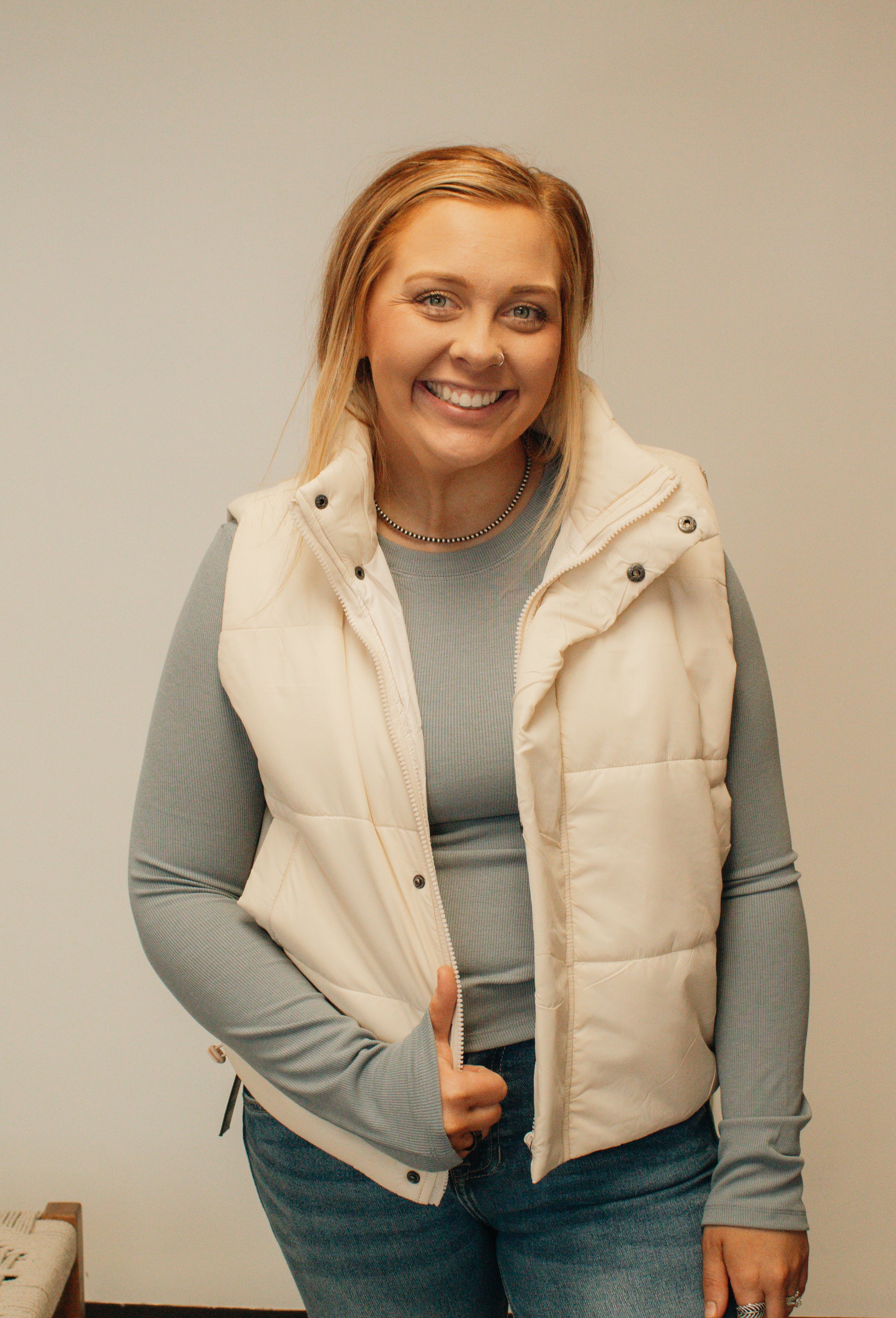 The On Repeat Vest in ivory is a versatile layering piece featuring both zip and button closures for flexible styling options. Wear it open over your favorite tee or button it up for a polished look. The neutral ivory shade pairs effortlessly with any outfit in your wardrobe, making it a go-to piece you'll reach for again and again.