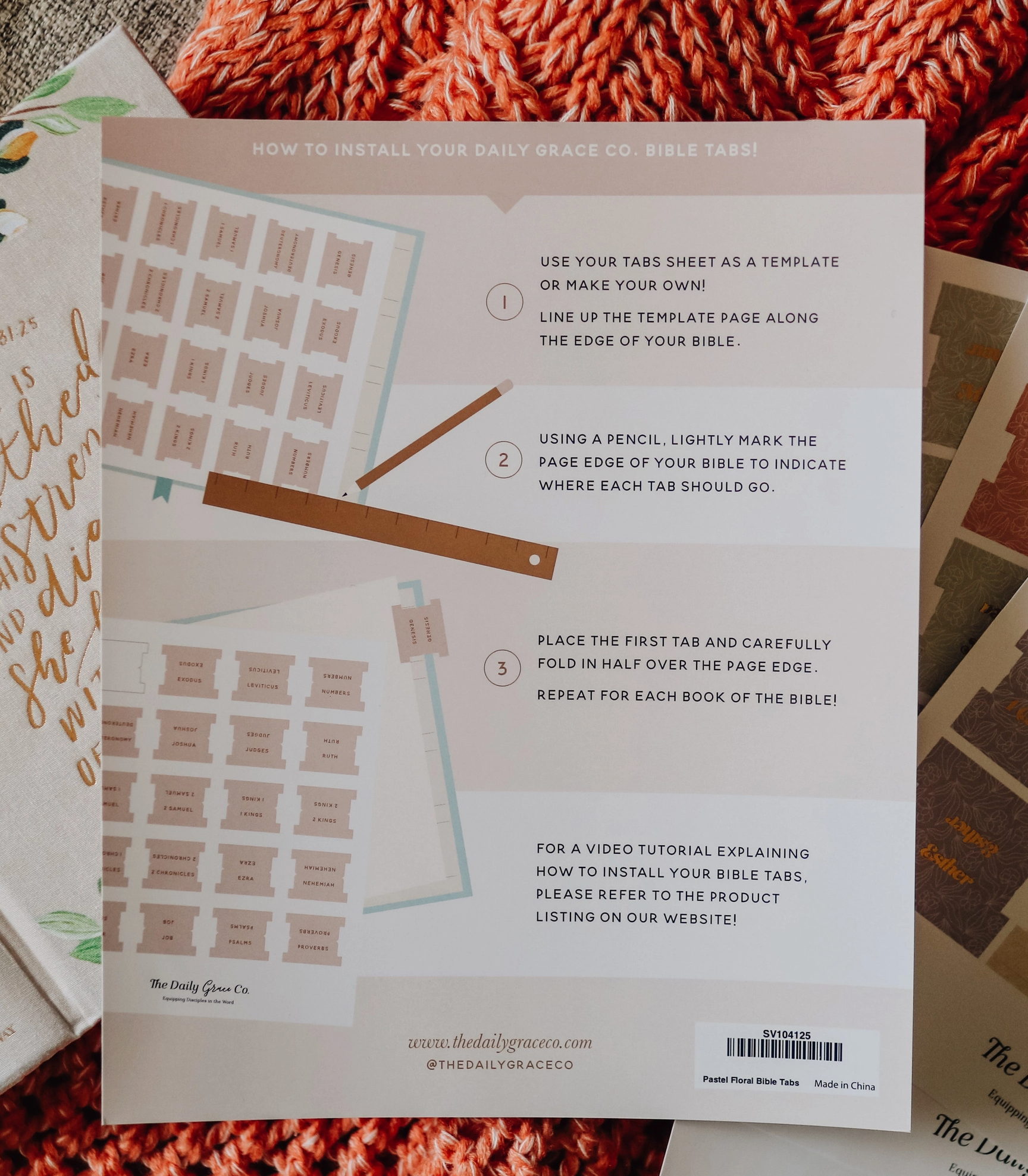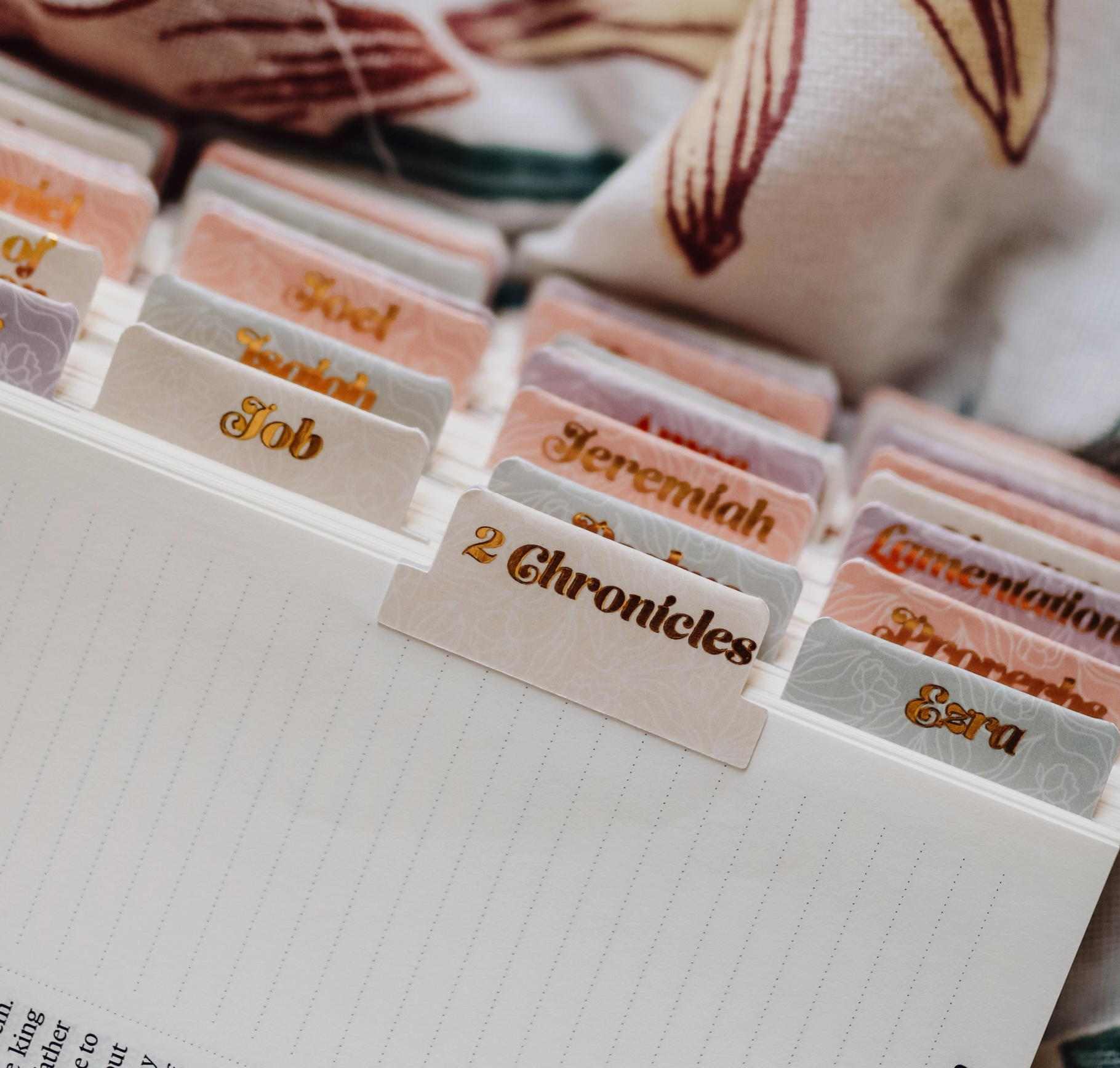 Tabs. These Bible tabs are both a beautiful and a practical way to help you navigate around your Bible. With the fun pastel floral design and high-quality paper, these tabs are sure to be a showstopper!